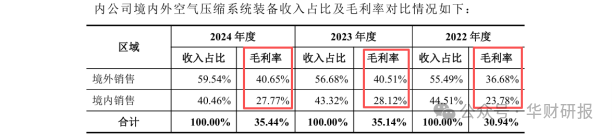 另一佐证是,德耐尔空气压缩系统配备境外发卖毛利率较着高于境内毛利率,差距正在13个百分点摆布(下图)。该产物境内23%-29%的毛利率程度,并不克不及取国内同业拉开差距,明显申明其手艺底蕴并不丰厚。